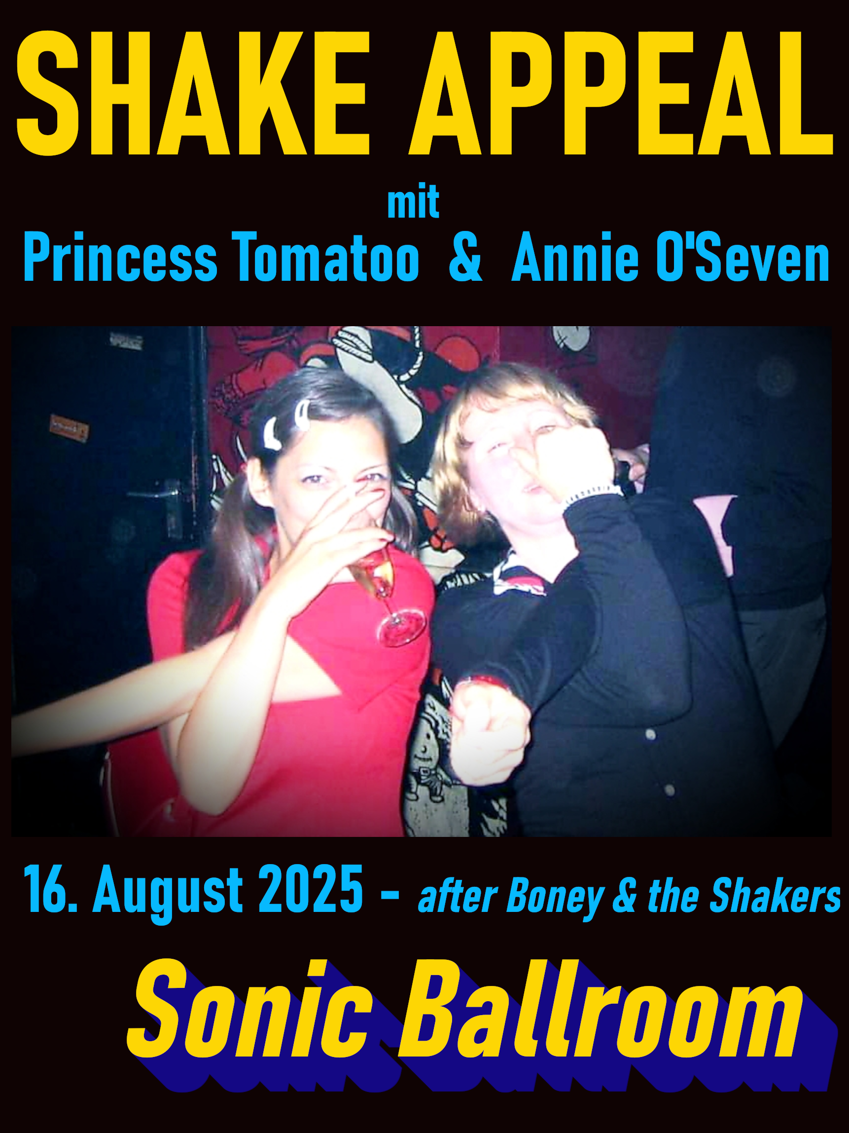 Garage, Beat, Soul, RnB, Mod Revival, TwoTone, Ska und PunkEs ist wieder soweit und Kölns coolste und grandioseste Band BONEY & THE SHAKERS spielt zum Tanz auf. Und im Anschluss wird gleich weiter getanzt, beim SHAKE APPEAL mit ANNIE O'SEVEN Und PRINCESS TOMATOO.