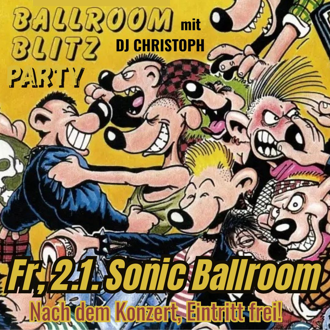 PunkRockHitzFür alle, deren Herz und Fuß für den Punkrock schlägt, bleiben im Sonic Ballroom in dieser Hinsicht keine Wünsche offen: geselliges Kreiseln im Moshpit zu 80-HC-Hits, gepflegtes Pogen zu Skatepunk und Ska und gemeinschaftliches Gröhlen von '77er-Hymnen an der Theke in Kettenfett-umnebelter Nostalgie gehört zum wöchentlichen Programm. Es ist natürlich auch gestattet, einfach nur zu den Genre-Üblichen TopHitz, das Tanzbein zu schwingen.