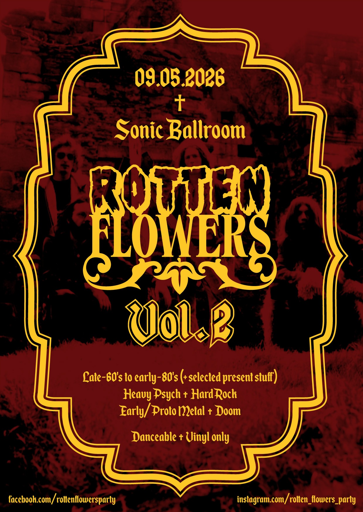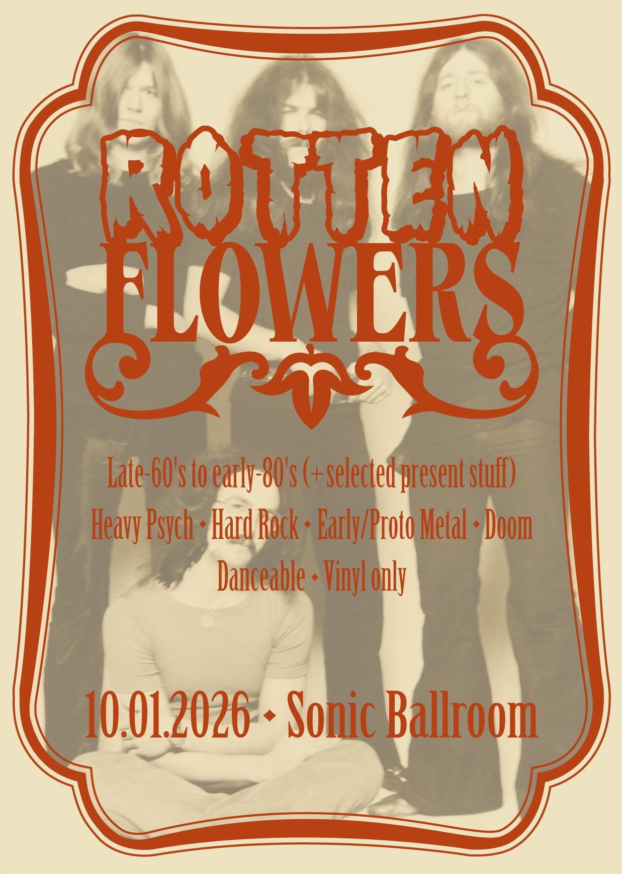 Late 60s to early 80s Heavy-Psych, Hard-Rock, Early Proto Metal, DoomRotten Flowers = zwei Jungs und ein Mädel, die ihre musikalischen Interessen in Kölns Clublandschaft unterrepräsentiert sehen. Zelebriert werden vor allem Heavy Psych, Hard Rock, Early/Proto Metal und Doom. Späte 60er bis frühe 80er, aber auch ausgewählter, artverwandter neuer Kram. Ob Original oder Repro, völlig wumpe.