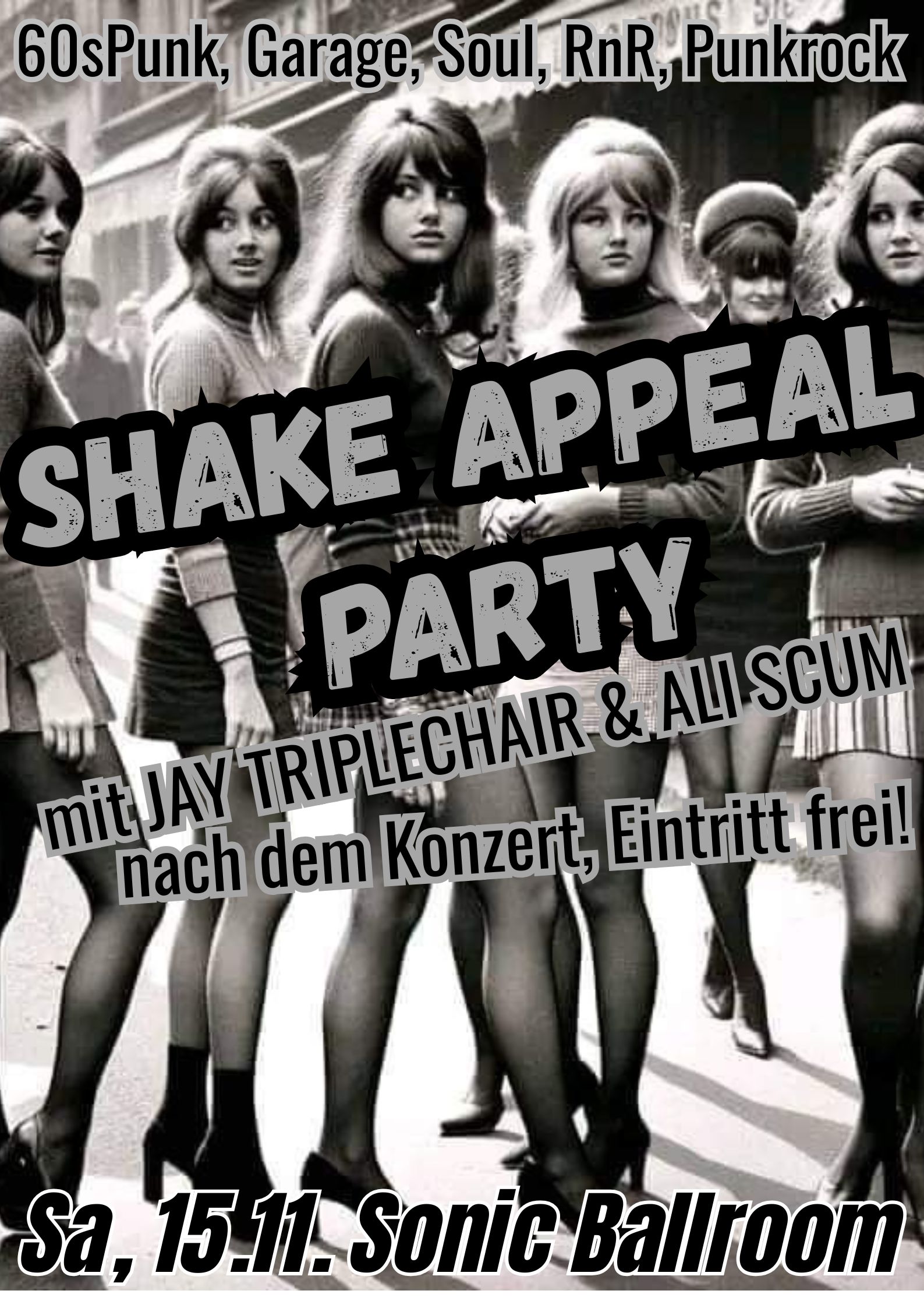 60sPunk, Garage, Soul, RnR, PunkrockBei "Shake Appeal" wird außer Köpfen und Fäusten auch offiziell im Sonic Ballroom alles geschüttelt, was geht: Bei der Shake Appeal-Party gibts sowohl erlesene als auch allseits bekannte Perlen aus den Schubladen 60's-Garagen-Rock-Punkrock- Rock'n'Roll, gut aufgelegt und erwählt von dem DJ Triumvirat Jay Triplechair , Seb Moriarty und Kitty Atomic oder auch den Koryphäen Danyell oder Kevin K . Egal ob Leder- oder Leopardenhose, Petticoat oder Kittelschürze - hier werden die Hüften geschwungen, denn es ist heiß, launig, rockig, rollig. Also: Shake it, baby!
