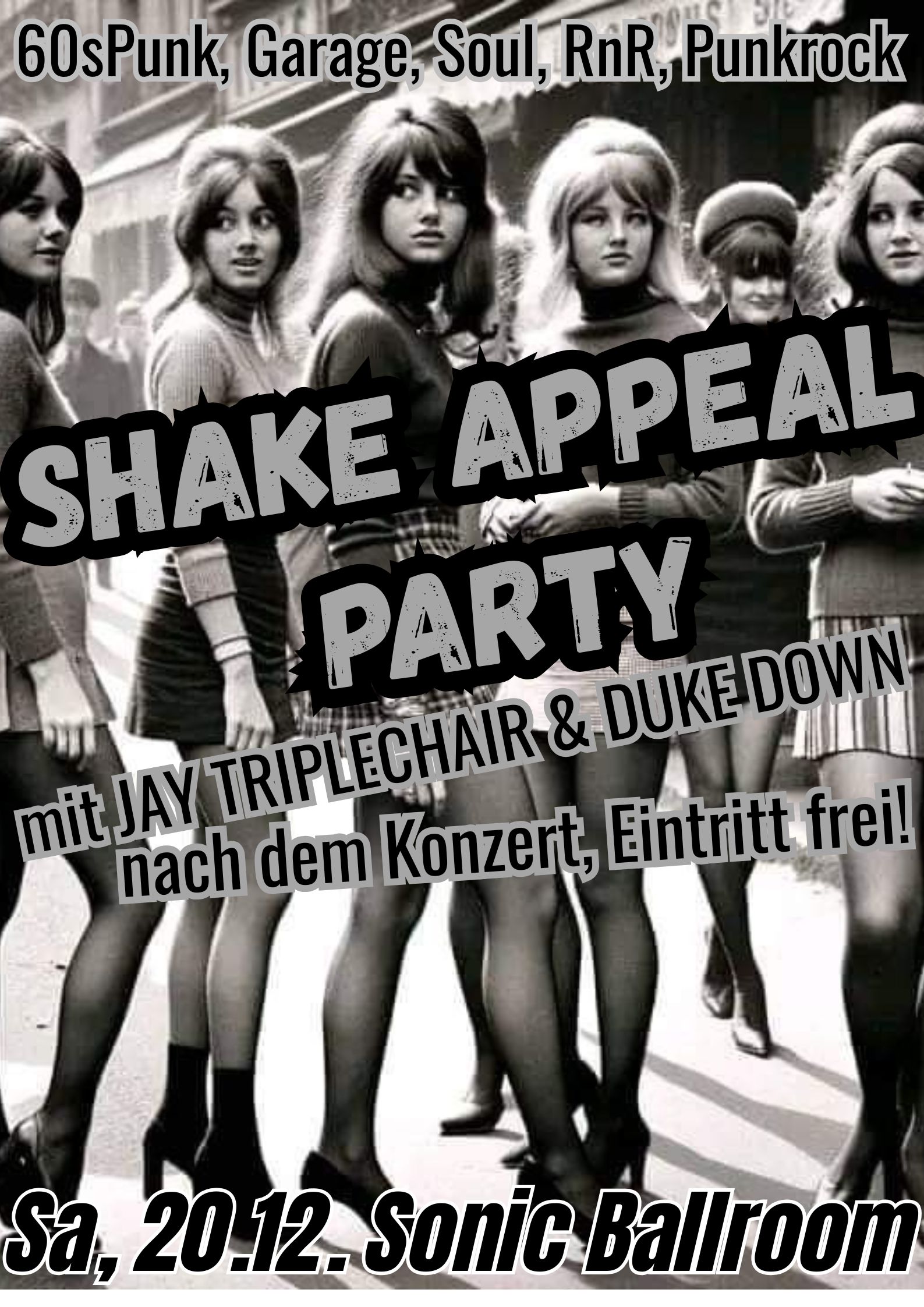 60sPunk, Garage, Soul, RnR, PunkrockBei "Shake Appeal" wird außer Köpfen und Fäusten auch offiziell im Sonic Ballroom alles geschüttelt, was geht: Bei der Shake Appeal-Party gibts sowohl erlesene als auch allseits bekannte Perlen aus den Schubladen 60's-Garagen-Rock-Punkrock- Rock'n'Roll, gut aufgelegt und erwählt von dem DJ Triumvirat Jay Triplechair , Seb Moriarty und Kitty Atomic oder auch den Koryphäen Danyell oder Kevin K . Egal ob Leder- oder Leopardenhose, Petticoat oder Kittelschürze - hier werden die Hüften geschwungen, denn es ist heiß, launig, rockig, rollig. Also: Shake it, baby!